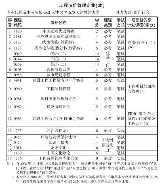 2019年天津自考工程造价管理专业本科考试计划已公布,请考生查看。